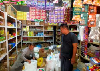 LHOKSEUMAWE - Personel Polsek Kuta Makmur mengecek stok sembako ke sejumlah pedagang di pasar Keude Blang Ara, Kuta Makmur,...