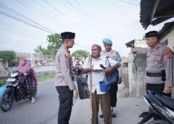 LHOKSEUMAWE - Kunjungi warga kurang mampu dan anak yatim, Kapolsek Dewantara, Ipda Adi Wirayuda Pratama, STrK bersama personel membagikan...