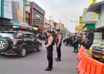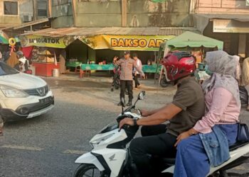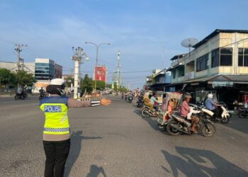 LHOKSEUMAWE - Personel Polsek Samudera mengatur arus lalu lintas guna mengantisipasi kemacetan menjelang waktu berbuka puasa di Keude Geudong,...