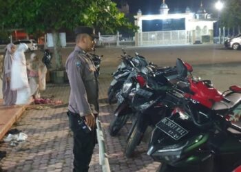 LHOKSEUMAWE - Cegah aksi pencurian kendaraan bermotor (curanmor) milik jemaah, personel Polsek Syamtalira Bayu siaga di Masjid Syuhada Mideun,...