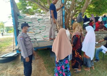 LHOKSEUMAWE - Personel Subsektor Banda Baro melakukan pengamanan penyaluran beras kepada ratusan masyarakat di aula Kecamatan Banda Baro, Aceh...