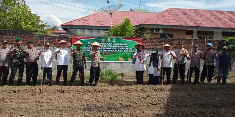Lhokseumawe – Dalam rangka mendukung program ketahanan pangan nasional, Polsek Banda Sakti Polres Lhokseumawe bersama instansi terkait dan masyarakat melaksanakan kegiatan Penanaman Jagung Serentak Kuartal III yang dipusatkan di lahan SKB, Jalan Panglateh, Desa Simpang Empat, Kecamatan Banda Sakti, Kota Lhokseumawe, Rabu sjang (09/07/2025).