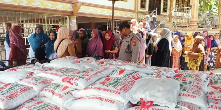 Lhokseumawe – Personel Polsek Blang Mangat melaksanakan pengamanan kegiatan operasi pasar beras murah yang digelar oleh Dinas Perindustrian, Perdagangan, Koperasi, dan Usaha Kecil Menengah (Disperindagkop UKM) di Gampong Jambo Mesjid, Kecamatan Blang Mangat, Kota Lhokseumawe, Selasa (5/8/2025) pagi.