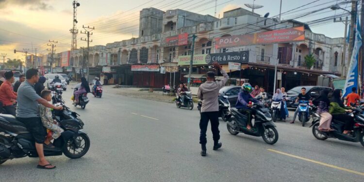 Lhokseumawe – Personel Polsek Blang Mangat melaksanakan pengamanan dan pengaturan lalu lintas di kawasan Simpang dan Pasar Keude Punteut, Kecamatan Blang Mangat, Kota Lhokseumawe, Kamis (6/3/2025) sore. Kegiatan ini dilakukan guna memastikan kelancaran arus kendaraan serta memberikan rasa aman kepada masyarakat yang beraktivitas menjelang waktu berbuka puasa di bulan suci Ramadhan 1446 H.