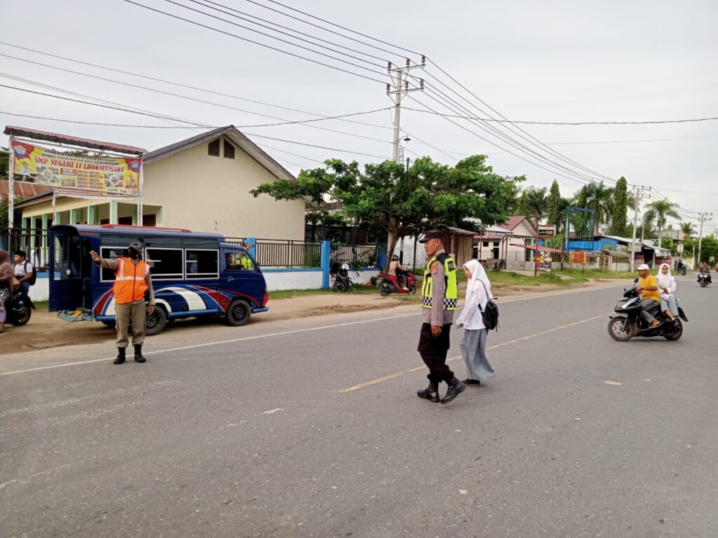 Mereka bertugas menjaga ketertiban dan kelancaran arus lalu lintas di jalan tersebut, terutama di sekitar pintu masuk sekolah MA/SMP guna mengantisipasi kemacetan yang rawan terjadi di wilayah Kecamatan Blang Mangat, ungkap Kapolsek