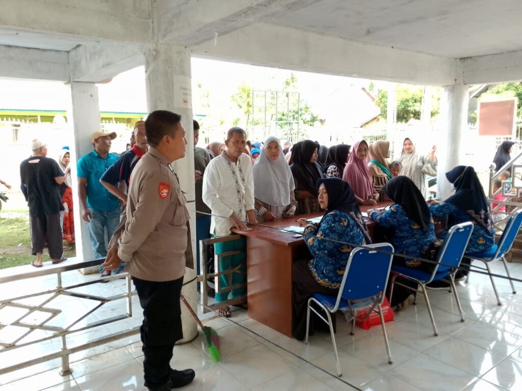 Lhokseumawe – Personel Polsek Blang Mangat turut mengawal jalannya kegiatan pasar murah yang digelar oleh Dinas Perindustrian, Perdagangan, Koperasi, dan Usaha Kecil Menengah (Disperindagkop) Kota Lhokseumawe di halaman Meunasah Desa Jambo Timu, Kecamatan Blang Mangat, Senin (17/2/2025).