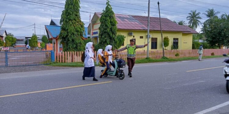 Lhokseumawe – Personel Polsek Blang Mangat melaksanakan kegiatan strong point berupa pengamanan dan pengaturan arus lalu lintas di Jalan Raya Medan–Banda Aceh, tepatnya di Desa Ule Blang Mane, Kecamatan Blang Mangat, Kota Lhokseumawe, Selasa (5/8/2025) pagi.