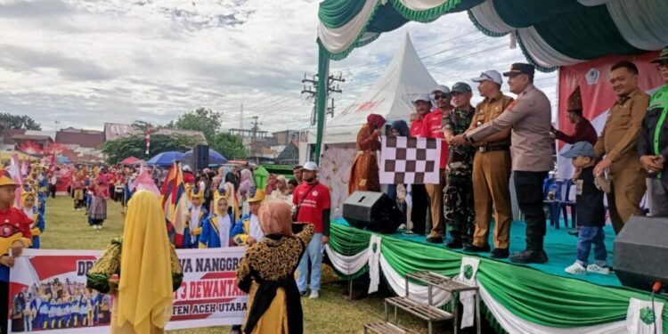 LHOKSEUMAWE – Polsek Dewantara menurunkan sejumlah personel untuk mengamankan dan mengawal jalannya pawai karnaval dalam rangka memperingati HUT RI ke-79 di Desa Keude Krueng Gekueh, Kecamatan Dewantara, Kabupaten Aceh Utara, pada Senin (19/8/2023).