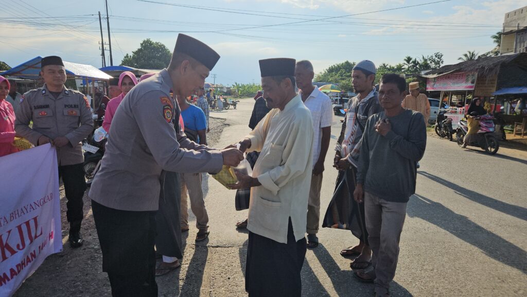 Aceh Utara – Menyambut bulan suci Ramadhan 1446 H, Polsek Meurah Mulia bersama Bhayangkari Ranting Meurah Mulia menggelar aksi sosial dengan membagikan 200 paket takjil kepada masyarakat dan pengguna jalan yang melintas di depan Mapolsek Meurah Mulia, Sabtu (15/3/2025) sore.