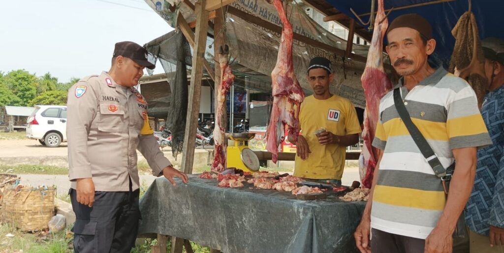 LHOKSEUMAWE – Personel Polsek Meurah Mulia melakukan pengecekan harga daging meugang dan stok sembako di pasar Jungka Gajah, Kecamatan Meurah Mulia, Aceh Utara, wilayah hukum Polres Lhokseumawe, Selasa (21/3/2023).