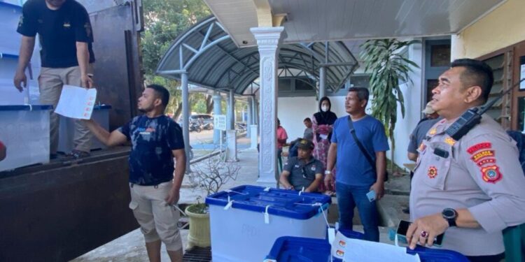 LHOKSEUMAWE – Polsek Muara Dua Kawal Material Logistik Pemilu ke Gudang dari Kantor Sekretariat PPK Kecamatan Muara Dua menuju Gudang Logistik KIP Kota Lhokseumawe, Minggu (25/2/2024).