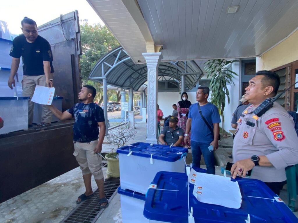 LHOKSEUMAWE – Polsek Muara Dua Kawal Material Logistik Pemilu ke Gudang dari Kantor Sekretariat PPK Kecamatan Muara Dua menuju Gudang Logistik KIP Kota Lhokseumawe, Minggu (25/2/2024).