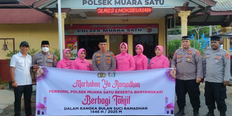 Lhokseumawe – Dalam rangka menyemarakkan bulan suci Ramadhan 1446 H, Polsek Muara Satu bersama Bhayangkari Ranting Muara Satu menggelar kegiatan pembagian takjil kepada masyarakat dan pengguna jalan di depan Mapolsek Muara Satu, Jalan Medan-Banda Aceh, Desa Batuphat Timur, Kecamatan Muara Satu, Kota Lhokseumawe, Sabtu (15/3/2025) sore.