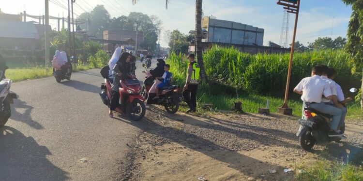 Aceh Utara – Dalam rangka menciptakan keamanan, keselamatan, ketertiban, dan kelancaran lalu lintas (Kamseltibcar Lantas), dua personel Polsek Nisam melaksanakan kegiatan pengamanan dan pengaturan arus lalu lintas di depan SMA Negeri 1 Nisam, Gampong Meunasah Meucat, Kecamatan Nisam, Kabupaten Aceh Utara, Rabu (09/04/2025) pagi.