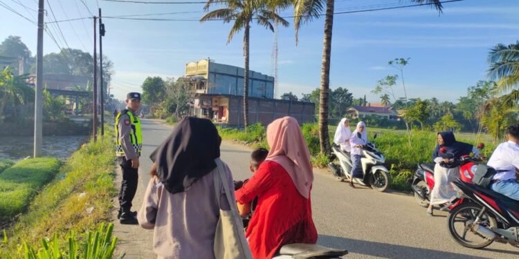 ACEH UTARA, Dalam upaya mengantisipasi kemacetan lalu lintas di depan Sekolah SMA Negeri 1 Nisam Desa Mns Meucat, Polsek Nisam Polres Lhokseumawe Polda Aceh melaksanakan kegiatan Strong Point pada pagi hari. Kegiatan ini bertujuan untuk memastikan arus lalu lintas berjalan lancar, terutama pada jam-jam sibuk di pagi hari.Senin 26 /08/2024 Pagi.