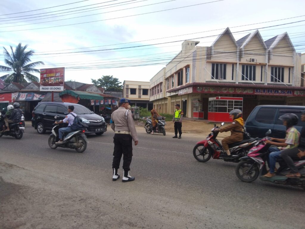 LHOKSEUMAWE, Dalam upaya mengantisipasi kemacetan lalu lintas di simpang keude Pasar Geudong Kec. Samudera, Anggota Polsek Samudera Polres Lhokseumawe Polda Aceh melaksanakan kegiatan Strong Point pada pagi hari. Kegiatan ini bertujuan untuk memastikan arus lalu lintas berjalan lancar, terutama pada jam-jam sibuk di pagi hari., Kamis, 17/10/2024 Pagi.