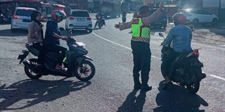 ACEH UTARA, Dalam upaya mengurangi kemacetan yang pada jam jam sibuk Personel Polsek Samudera Polres Lhokseumawe Polda Aceh melaksanakan pengaturan di seputaran keude Geudong di Kecamatan Samudera (27/8/2024).pagi.