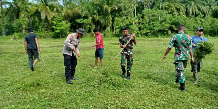 LHOKSEUMAWE – Jajaran Polsek Simpang Keuramat dan Koramil Simpang Keuramat membangun kekompakan melalui kegiatan gotong royong di Desa Pase Sentosa, Simpang Keuramat, Aceh Utara, wilayah hukum Polres Lhokseumawe, Jumat (5/5/2023).