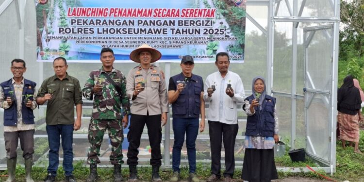 ACEH UTARA – Polsek Simpang Keuramat bersama Muspika dan masyarakat melaksanakan kegiatan Launching Penanaman Serentak Perkarangan Pangan Bergizi Polres Lhokseumawe Tahun 2025 di Gampong Seunebok Punti, Kecamatan Simpang Keuramat, Aceh Utara, Jumat (03/01/2025).