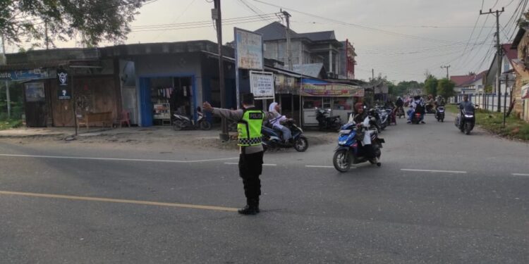 ACEH UTARA – Polsek Syamtalira Bayu, Polres Lhokseumawe Polda Aceh melaksanakan kegiatan pengaturan arus lalu lintas (Lalin) dalam rangka giat Strong Point Pagi. Kegiatan ini bertujuan untuk mengurangi kemacetan dan memastikan kelancaran aktivitas masyarakat di pagi hari, terutama di jalur-jalur yang padat arus kendaraan seperti jalan Medan – Banda Aceh khususnya di daerah persekolahan Simpang Cot Plieng Kec. Syamtalira Bayu. Kab. Aceh Utara. Rabu 05 /02/2025 pagi.