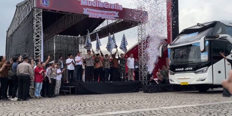 Jakarta: Gubernur Jakarta, Pramono Anung resmi melepas pemudik yang mengikuti program Mudik Gratis Pemerintah Provinsi (Pemprov) DKI Jakarta Tahun 2025, di Silang Monas Barat, Jakarta Pusat, pada Kamis (27/3/2025). Dalam kesempatan ini, Pramono memberangkatkan ratusan bus mudik gratis ke 20 kota/kabupaten di 6 provinsi di Indonesia.