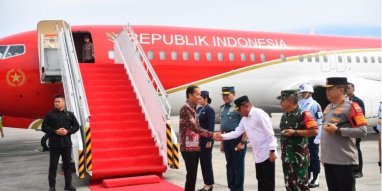MEDAN – Presiden Joko Widodo tiba di Bandara Internasional Kualanamu, Kabupaten Deli Serdang, Provinsi Sumatra Utara, pada Sabtu, 19 Agustus 2023, sekitar pukul 09.20 WIB, dalam rangka kunjungan kerja. Kedatangan Presiden disambut langsung oleh Panglima TNI Laksamana Yudo Margono, Gubernur Sumatra Utara Edy Rahmayadi, Pangdam I Bukit Barisan Mayjen TNI Achmad Daniel C, dan Kapolda Sumatra Utara Irjen Pol Agung Setya Imam.