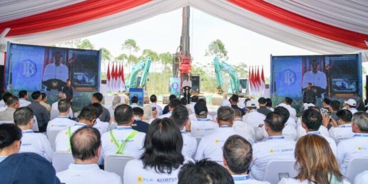 KALIMANTAN TIMUR – Presiden Joko Widodo secara resmi melakukan peletakan batu pertama atau groundbreaking untuk memulai pembangunan Kompleks Perkantoran Bank Indonesia di Ibu Kota Nusantara (IKN), Provinsi Kalimantan Timur, Kamis (2/11/2023). Presiden Jokowi meyakini pembangunan tersebut akan makin meningkatkan kepercayaan publik dan dunia usaha pada IKN dan mendukung pertumbuhan ekonomi di IKN.