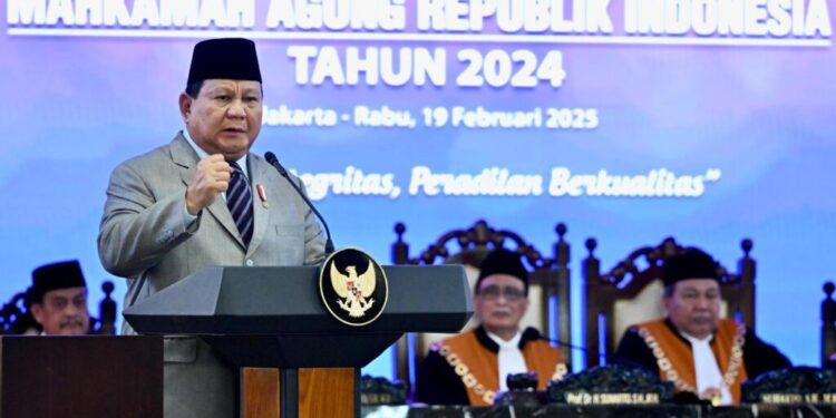JAKARTA – Presiden Prabowo Subianto menghadiri Sidang Istimewa Laporan Tahunan Mahkamah Agung Republik Indonesia Tahun 2024 yang digelar di Gedung Mahkamah Agung, Jakarta, pada Rabu, 19 Februari 2025. Dalam sambutannya, Presiden menyampaikan apresiasi kepada seluruh anggota peradilan atas perannya dalam menegakkan hukum di Indonesia.