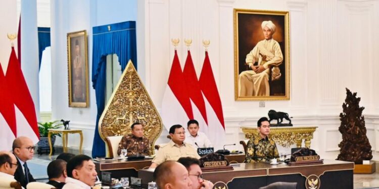 Presiden Prabowo Subianto memimpin rapat terbatas yang membahas perkembangan Kawasan Ekonomi Khusus (KEK) bersama sejumlah Menteri Kabinet Merah Putih di Istana Merdeka, Jakarta, pada Selasa (22/07/2025). Rapat tersebut digelar secara hybrid, di mana Presiden Prabowo, Wakil Presiden Gibran Rakabuming, sejumlah menteri, dan perwakilan KEK yang hadir secara langsung di Istana Merdeka terhubung dengan sejumlah perwakilan KEK lainnya dari berbagai wilayah di tanah air melalui video konferensi.