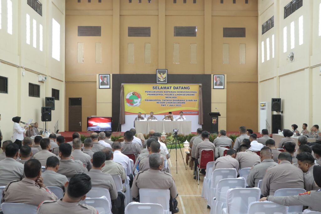 Dalam sambutannya, Kapolres Lhokseumawe menyampaikan apresiasi atas perkembangan koperasi yang kini bertransformasi ke sistem syariah. Menurutnya, perubahan bentuk koperasi ini tidak hanya untuk memperkuat tata kelola, tetapi juga sejalan dengan Qanun Aceh yang mengatur pelaksanaan sistem syariah dalam berbagai aspek kehidupan masyarakat, termasuk sektor perkoperasian. Primkopol Polres Lhokseumawe selama ini dikelola secara sehat dan transparan, bahkan berhasil menghimpun dana anggota hingga Rp 8 miliar yang telah beredar di kalangan anggota.