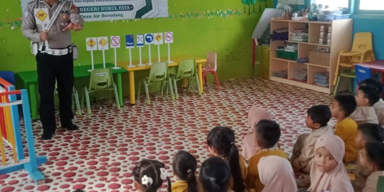 Tapaktuan – Satlantas Polres Aceh Selatan Polda Aceh kembali mengadakan program Polisi Sahabat Anak dengan memberikan pengenalan rambu-rambu lalu lintas kepada anak-anak usia dini. Kegiatan ini berlangsung di TK Nurul Fata, Kecamatan Tapaktuan, Kabupaten Aceh Selatan, Selasa, 21 Januari 2025.