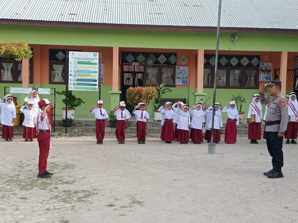 LHOKSEUMAWE – Personel Polsek Syamtalira Bayu menjadi pembina upacara bendera di Sekolah Dasar (SD) Negeri 5 Syamtalira Bayu, Aceh Utara, wilayah hukum Polres Lhokseumawe, Senin (20/3/2023) pagi.