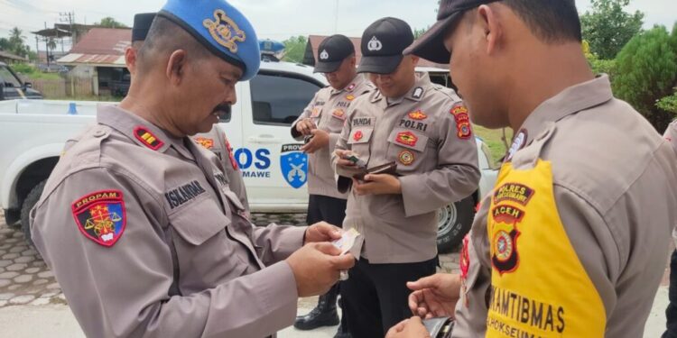 LHOKSEUMAWE – Propam Polres Lhokseumawe menggelar operasi penegakan ketertiban dan disiplin (gaktiblin) di Mako Polsek Meurah Mulia, Rabu (10/5/2023).