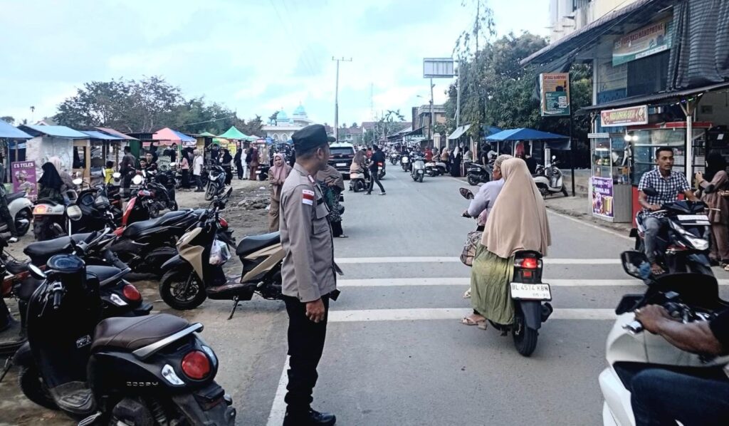 Aceh Utara – Personel Polsek Syamtalira Bayu melaksanakan kegiatan pengamanan dan pengaturan arus lalu lintas menjelang waktu berbuka puasa Ramadhan 1447 Hijriah di kawasan Pasar Keude Bayu, Kecamatan Syamtalira Bayu, Kabupaten Aceh Utara, Minggu (8/3/2026) sore.