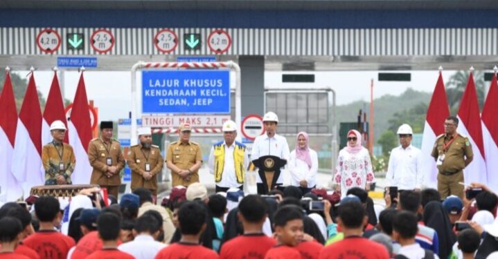 BENGKULU – Presiden Joko Widodo didampingi Ibu Iriana Joko Widodo meresmikan jalan tol ruas Bengkulu-Taba Penanjung, Kamis (20/7/2023), Presiden Jokowi menilai dengan beroperasinya ruas tol tersebut dapat menciptakan titik pertumbuhan ekonomi baru.