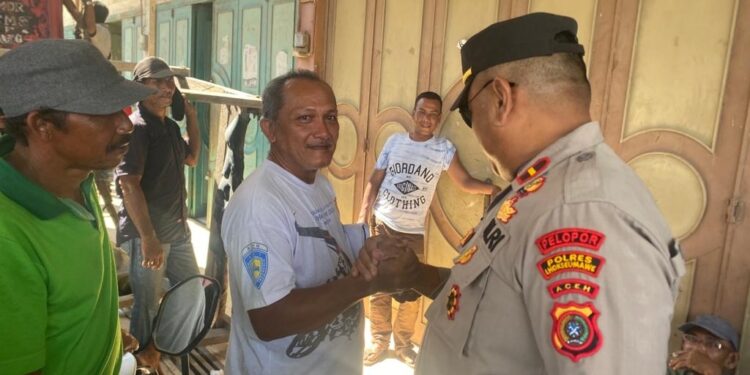LHOKSEUMAWE – Kapolsek Muara Dua, Ipda Roni, SH menyambagi buruh bongkar muat di Desa Meunasah Mee, Kecamatan Muara Dua, Kota Lhokseumawe, Jumat (2/6/2023).