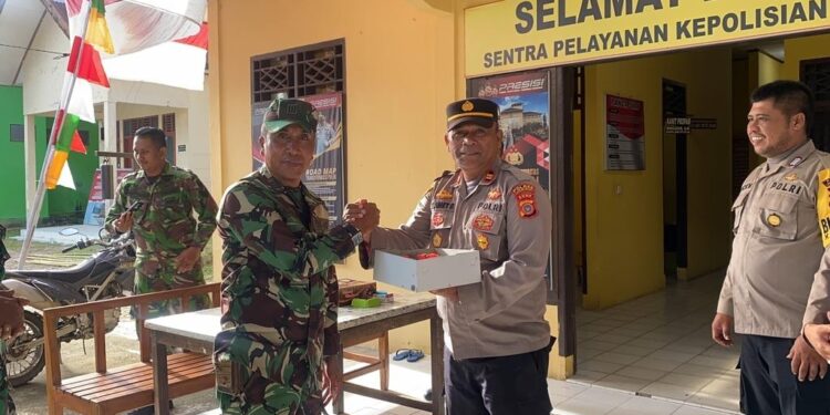LHOKSEUMAWE – Kapolsek Sawang, Iptu Slamet Rezeki menerima kunjungan Danramil 19 Sawang, Kapten Inf Lisker L Malau, kegiatan tersebut dalam rangka Hari Bhayangkara ke 77, Kamis (29/6/2023).
