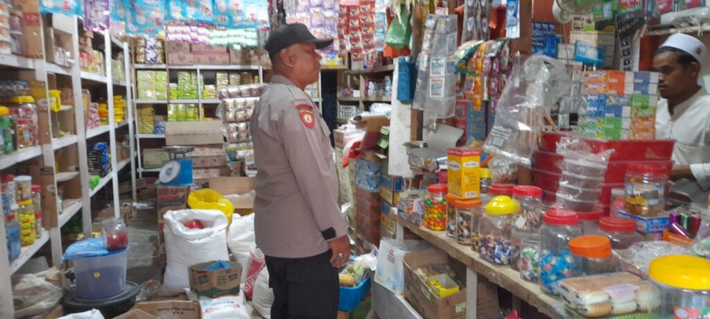 LHOKSEUMAWE – Personel Polsek Kuta Makmur menyambagi pedagang untuk mengecek stok sembako di pasar Keude Krueng Manyang, Kuta Makmur, Aceh Utara, wilayah hukum Polres Lhokseumawe, dalam kegiatan ini personel juga memberi himbauan ke pedagang, Senin (20/2/2023).