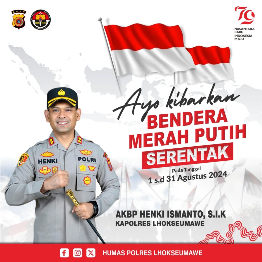 LHOKSEUMAWE – Kapolres Lhokseumawe, AKBP Henki Ismanto, S.I.K mengajak seluruh masyarakat mengibarkan Bendera Merah Putih selama satu bulan penuh pada bulan Agustus 2024 dalam rangka menyambut Hari Ulang Tahun (HUT) ke-79 Republik Indonesia.