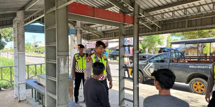 LHOKSEUMAWE – Personel Sat Samapta Polres Lhokseumawe menyampaikan pesan Kamtibmas dengan menyambagi warga di halte di wilayah hukum Polres Lhokseumawe, Minggu (18/11/2023).