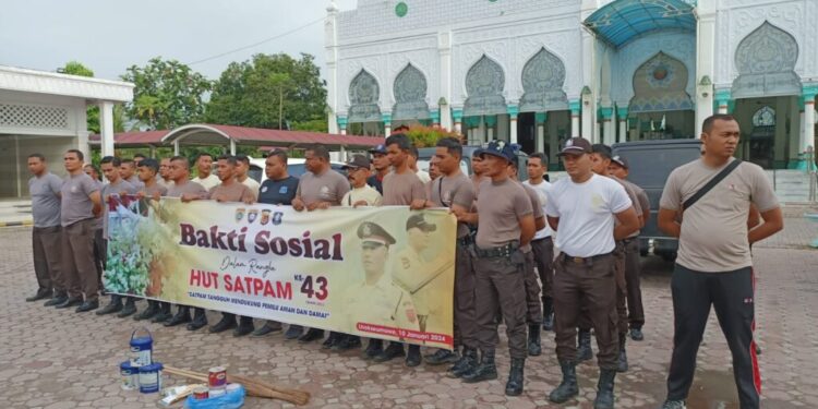 LHOKSEUMAWE – Sat Binmas Polres Lhokseumawe menggelar bakti sosial (baksos) dalam rangka memperingati HUT ke 43 Satpam di Masjid Al-Ikhlas, Desa Batuphat Timur, Kecamatan Muara Satu, Kota Lhokseumawe, Rabu (10/1/2024).