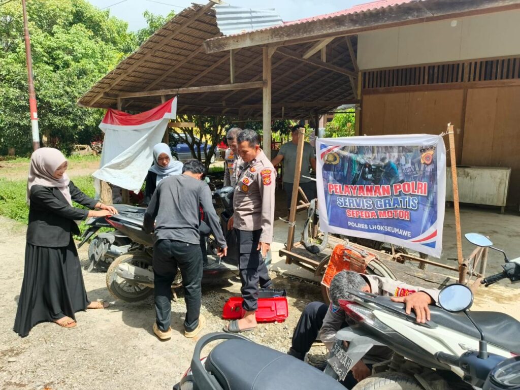 Aceh Utara – Dalam rangka meningkatkan kualitas pelayanan serta mempererat hubungan antara Polri dan masyarakat, personel Satuan Pembinaan Masyarakat (Sat Binmas) Polres Lhokseumawe melaksanakan kegiatan servis motor keliling dan cuci motor gratis bagi warga yang terdampak banjir di Desa Seunubok Punti, Kecamatan Simpang Keuramat, Aceh Utara, Rabu (17/12/2025).