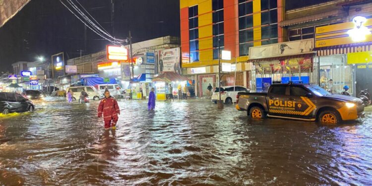 Di lokasi banjir, personel Sat Samapta melakukan pengaturan lalu lintas, membantu pengendara melewati genangan air, serta memberikan imbauan agar tetap berhati-hati ketika melintas di jalur rawan.