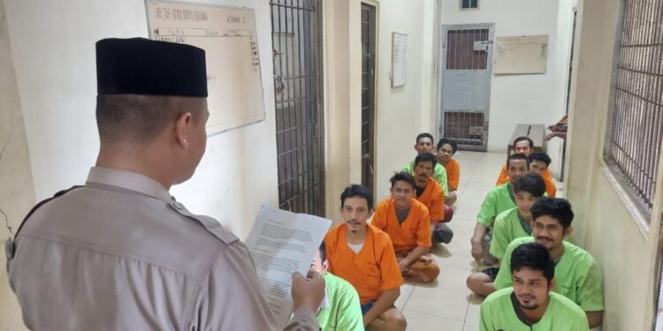 LHOKSEUMAWE – Personel Sat Tahti memberikan bimbingan rohani kepada para tahanan di Rutan Mapolres Lhokseumawe, Jumat (20/10/2023), kegiatan ini merupakan salah satu program prioritas rutin diselenggarakan setiap hari Jumat.