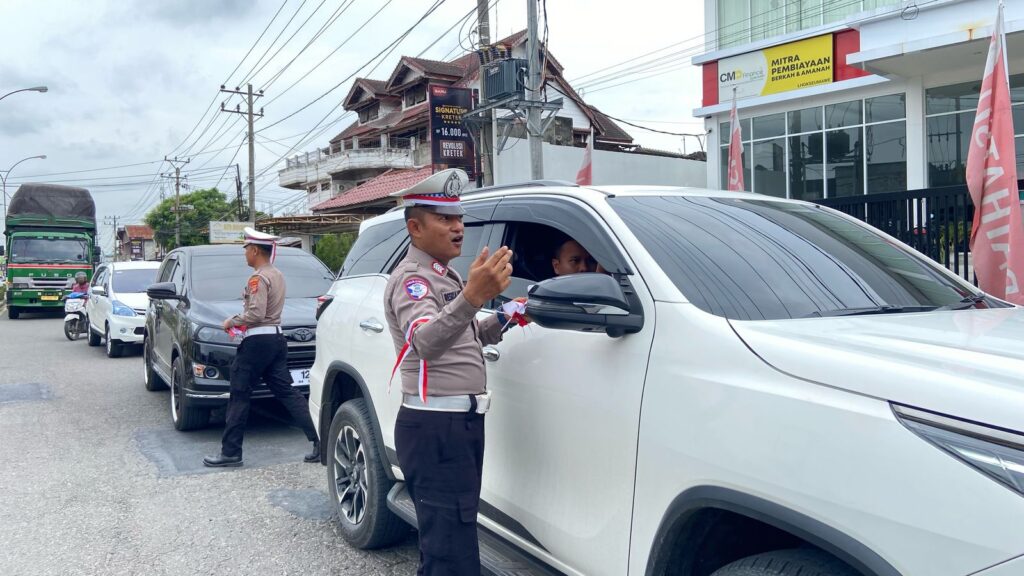 Lhokseumawe – Menyambut Hari Kemerdekaan Republik Indonesia ke-80, Satuan Lalu Lintas (Satlantas) Polres Lhokseumawe menggelar kegiatan Polantas Menyapa dengan membagikan bendera merah putih kepada pengendara di Jalan Medan – Banda Aceh, tepatnya di depan Dealer Capela Honda, Desa Panggoi, Kecamatan Muara Dua, Kamis (7/8/2025).