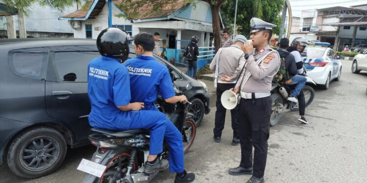 LHKOSEUMAWE- Unit Kamsel Satlantas Polres Lhokseumawe melaksanakan kegiatan penyuluhan keliling atau yang dikenal sebagai meupep-pep kepada masyarakat pengguna di Simpang Pos Lantas Cunda, Kecamatan Muara Dua, Kota Lhokseumawe, selasa (10/12/2024) pagi.