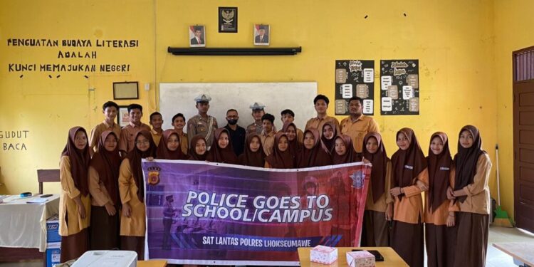 LHOKSEUMAWE – Unit Kamsel Satlantas Polres Lhokseumawe kembali melaksanakan program rutin “Police Goes To School” yang kali ini berlangsung di SMA N 6 Lhokseumawe, Sabtu (31/8/2024) pagi.