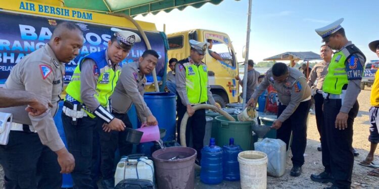 ACEH UTARA — Satuan Lalulintas Polres Aceh Utara menyalurkan air bersih sebanyak lima tangki mobil untuk masyarakat empat desa di Kecamatan Tanah Jambo Aye, Minggu (10/09/2023).