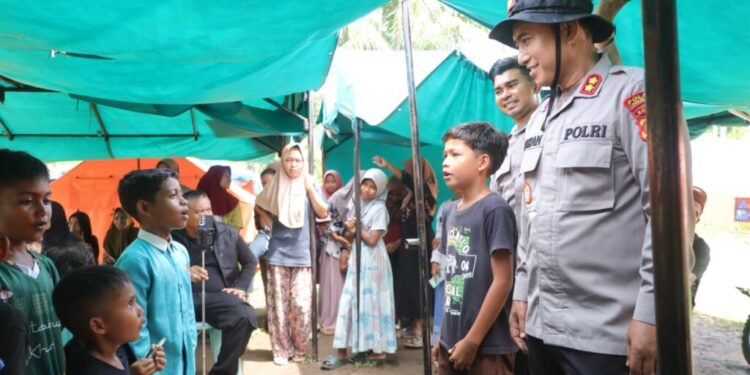 Kapolres juga berbaur dengan anak-anak di lokasi pengungsian. Ia mengajak mereka berbincang, memberi motivasi, dan menyemangati agar tetap ceria menjalani hari-hari di bulan suci. Di tengah keterbatasan, senyum anak-anak yang kembali merekah menjadi gambaran bahwa perhatian dan kehadiran aparat sangat berarti.