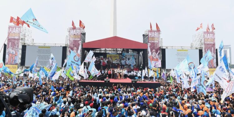 Jakarta- Peringatan Hari Buruh Internasional di Monumen Nasional, Kamis (01/05/2025) dihadiri langsung oleh Presiden Prabowo Subianto. Acara ini dihadiri lebih dari 200 ribu buruh dan pekerja dari berbagai daerah di tanah air. Mereka berkumpul untuk menyampaikan aspirasinya dalam momentum yang diperingati setiap tahunnya ini.